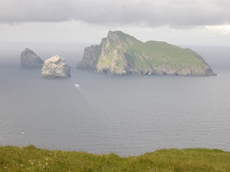 Bei der rund vierstündigen Überfahrt von der Isle of Skye kommt als erstes Boreray in Sicht, die östlichste der vier Inseln des Archipels. Eine Wolkenschleppe lässt sie wie einen aktiven Vulkan erscheinen. Tatsächlich sind die Inseln und Stacs Saint Kildas die Scherben eines vor Urzeiten explodierten Supervulkans. Am linken Bildrand sind eben noch die Klippen der Hauptinsel Hirta zu erkennen.